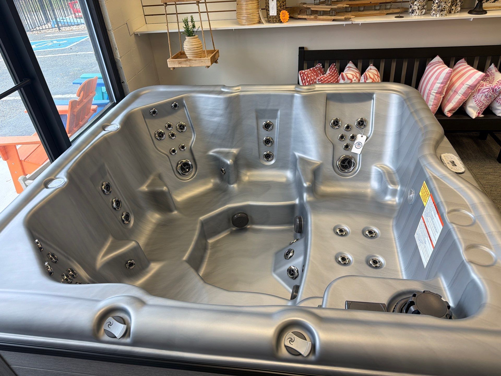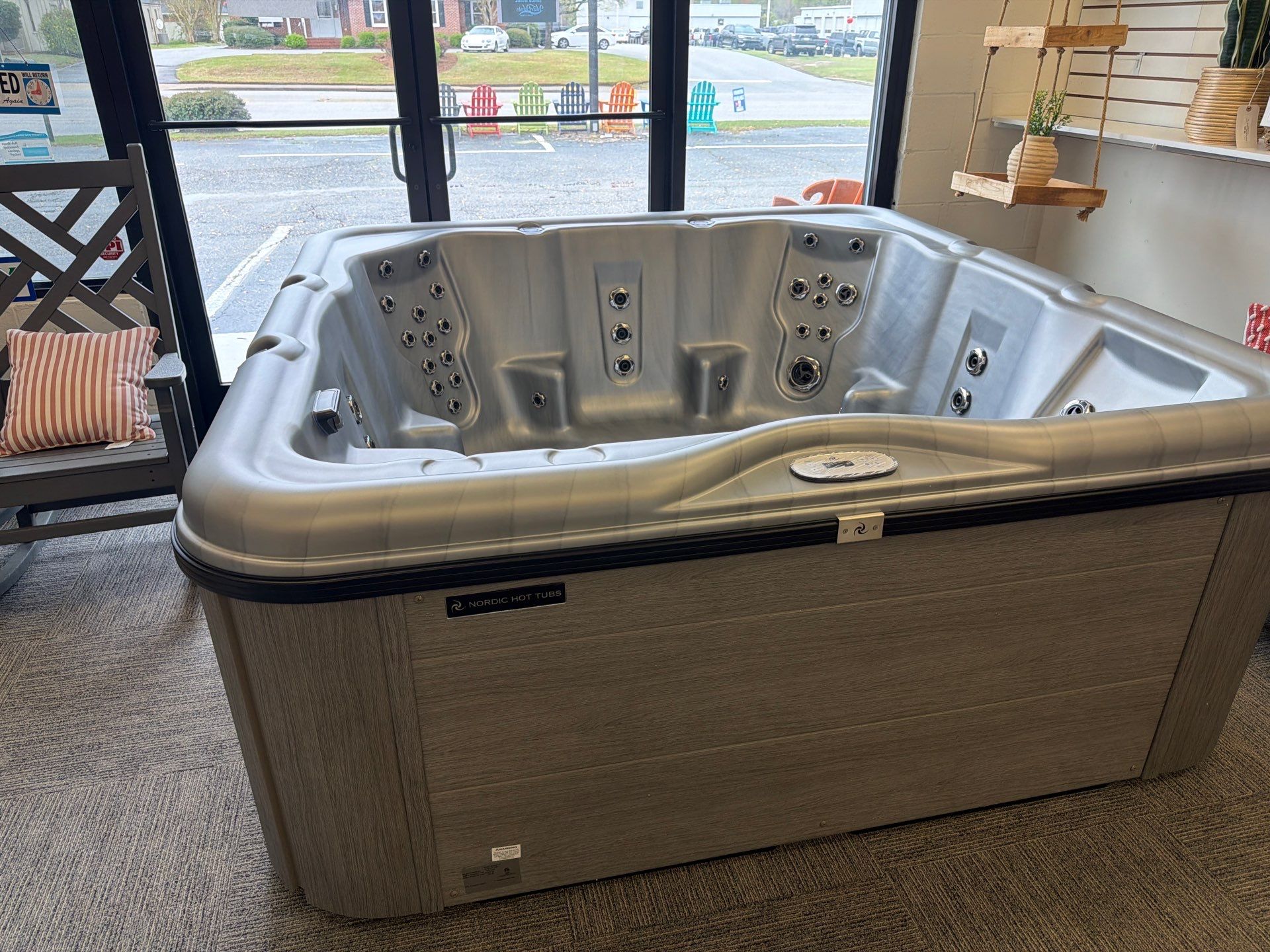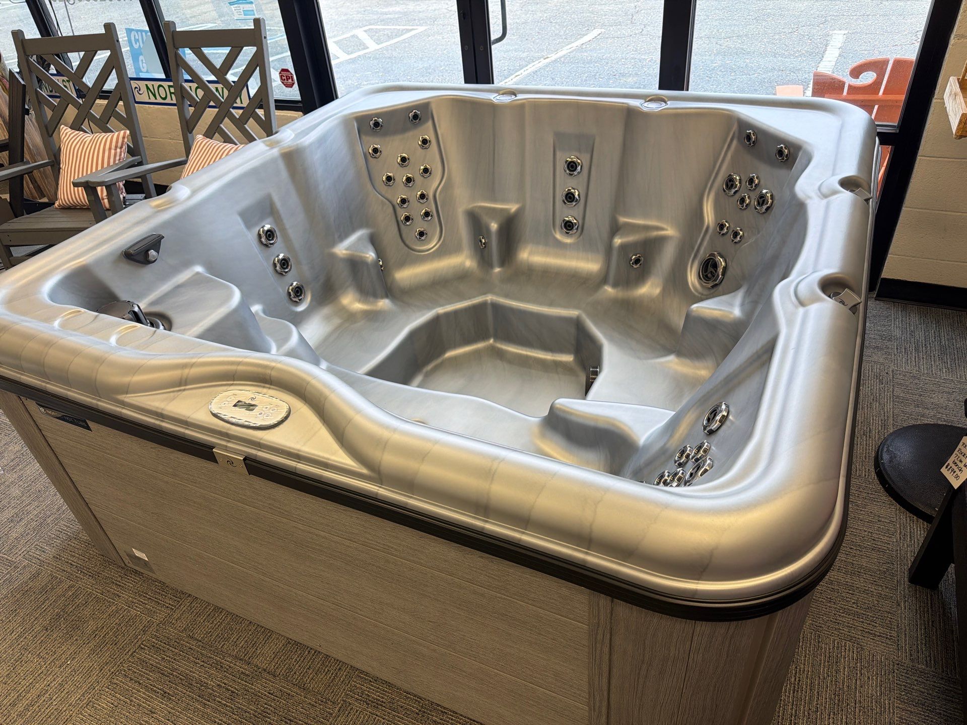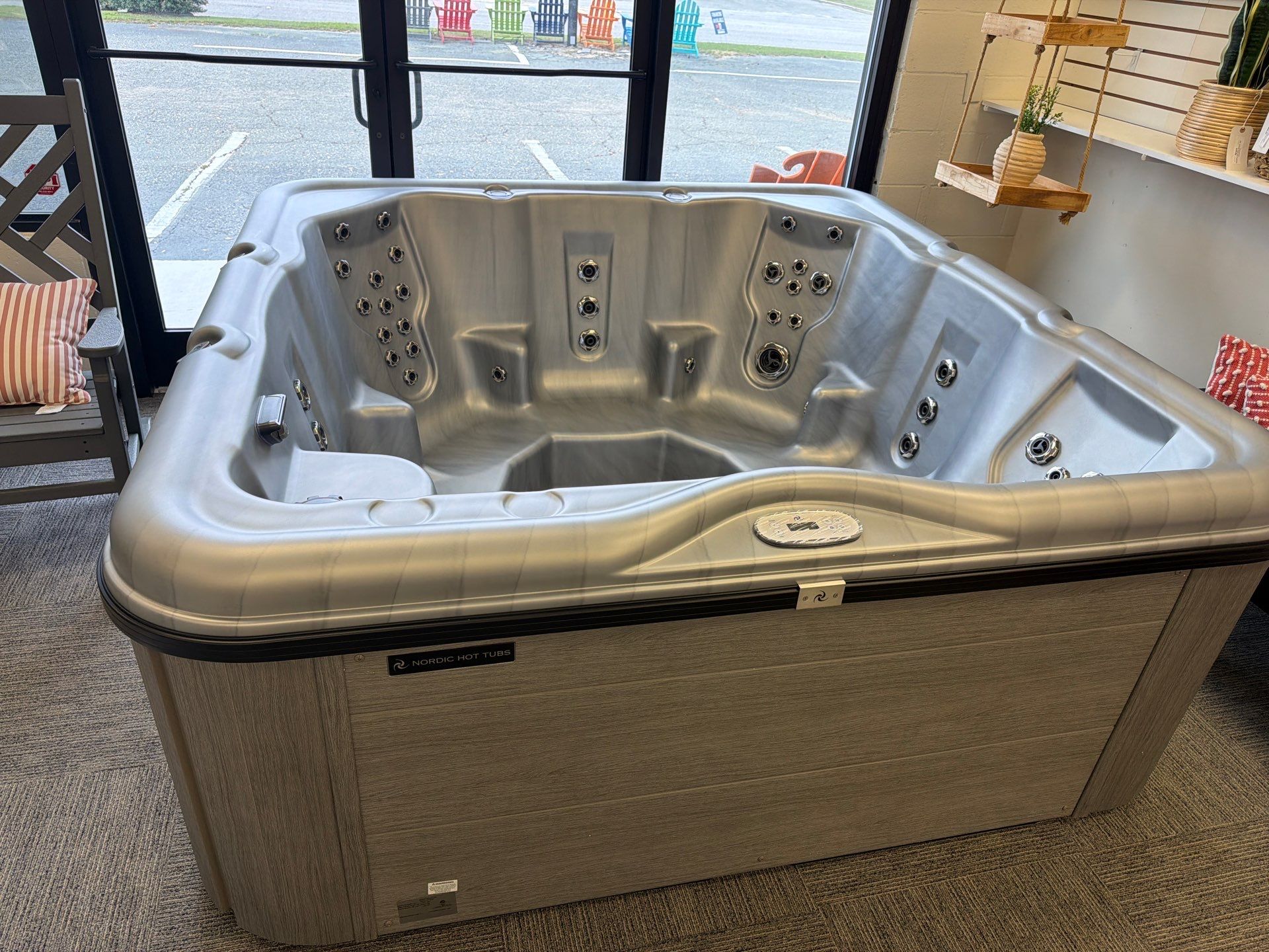 The Encore LS™ from Nordic Hot Tubs offers a powerful, full-body hydrotherapy experience with seating for up to six, including a No-Float lounger and 53 stainless steel jets. It features the Dual Therapy System™ for a perfect mix of whirlpool flow and targeted massage. This model also includes the upgraded Bluetooth stereo system, allowing you to enjoy your favorite music while you relax.